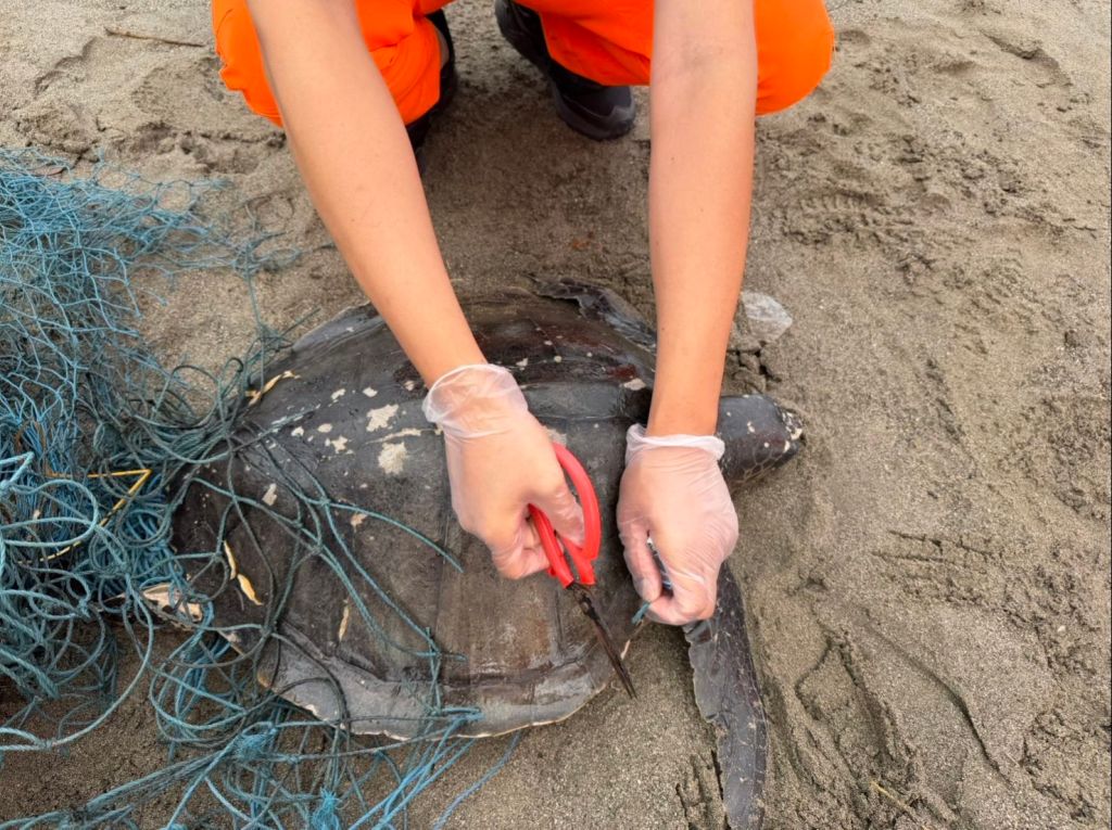 第一三岸巡隊第二機動巡邏站接獲通報後,立即派員趕赴現場,經檢視個體狀況,隨即協助移除纏繞漁網,並通報臺東縣政府畜產保育科及海洋保育署臺東海洋保育站,經專業人員判斷該海龜品種為欖蠵龜,後續將該海龜交由臺東縣政府畜產保育科後送至國立海洋生物博物館醫治。