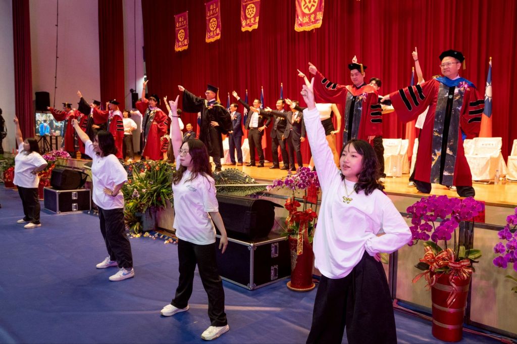 整場典禮在溫馨感人的氛圍中進行,還有豐富的表演節目為典禮增色。音樂系同學演唱和伴奏《時間煮雨》,以優美歌聲為典禮帶來動人的音樂饗宴。典禮的最高潮是東舞社同學熱情洋溢的舞蹈演出,動感的舞蹈,引來全場不斷的尖叫;而鄭校長及台上主管也放下身段,穿著博士袍與同學們歡樂共舞,整齊劃一的動作,贏得現場的掌聲。台東大學114級畢業典禮,在師生歡樂共舞的溫馨畫面中劃下完美句點。