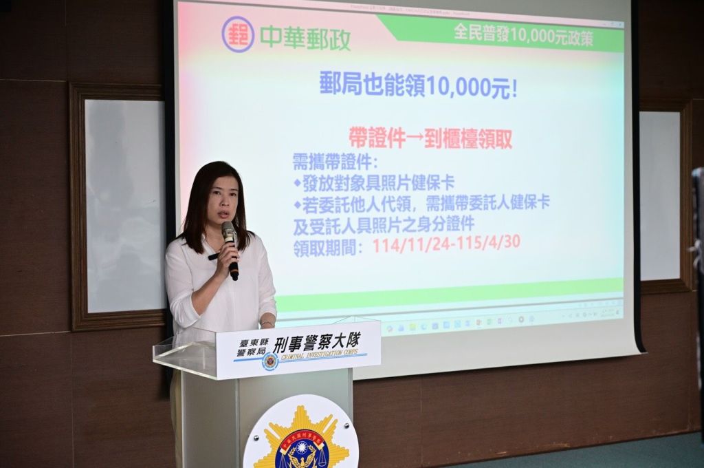 隨後臺東郵局行銷科葉詩縈科長分享,全民普發1萬元政策上路,民眾可於11月24日起攜帶證件(具照片健保卡)至郵局領取,並提醒普發現金防詐3「不」:不需匯手續費、不點擊來路不明連結、不把金融卡交付予任何人,避免遭詐。